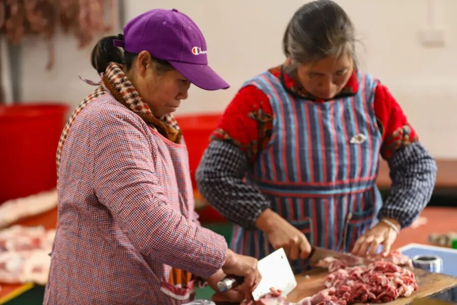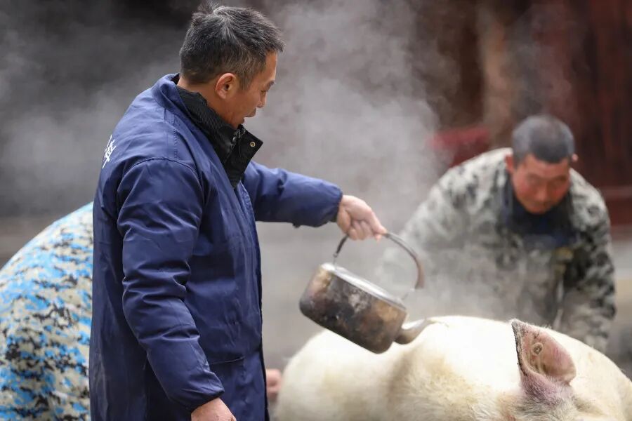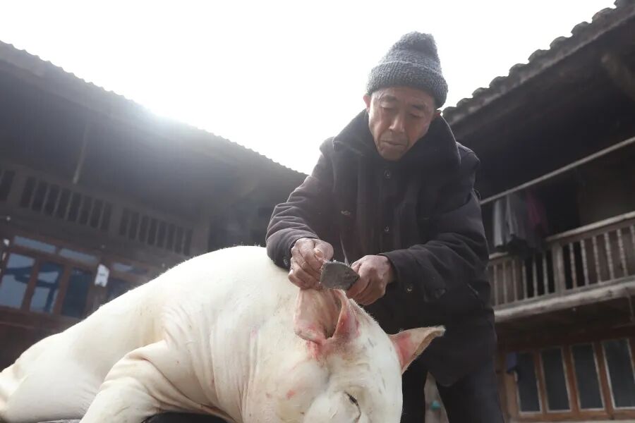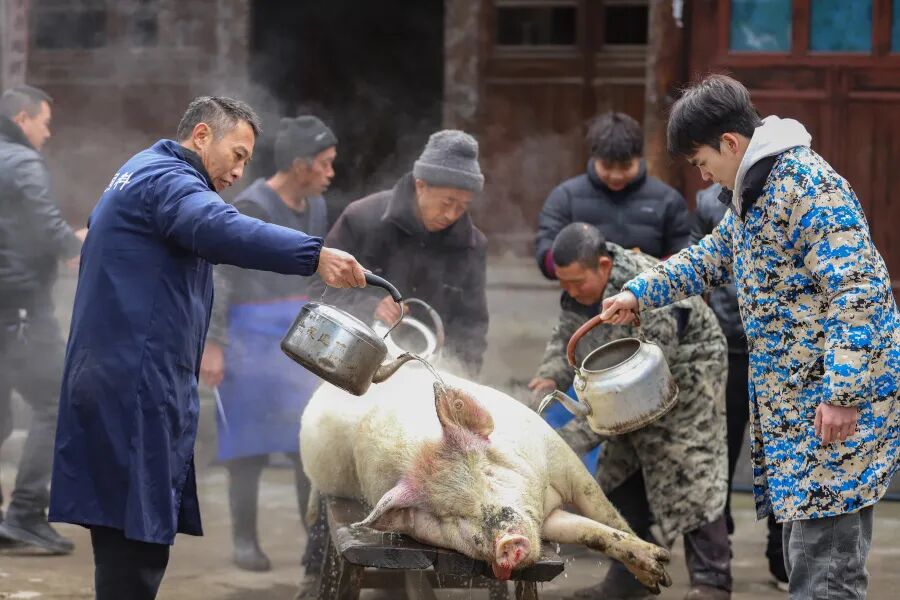 清晨的薄雾还萦绕在杨柳镇中山村的屋檐上,第一缕阳光刚越过山岗,墙角的枯草上还凝结着三九天的寒气,村民陈绍宽家的院子里就已响起了此起彼伏的吆喝声。七八个身着土家服饰的汉子已挽起衣袖,合力将一头膘肥体壮的白毛猪从圈里牵出。这头被陈绍宽精心饲养了一年半的“粮食猪”,吃的是红苕、洋芋、猪草,肉质紧实细嫩,是土家人冬日里最珍贵的馈赠 。架在柴火灶上的铁锅此刻早已烧得滚烫,蒸汽氤氲中,烧水、放血、褪毛、开膛……一系列动作有条不紊,汉子们黝黑的脸上渗出细密的汗珠,与空气中弥漫的肉香、柴火香交织在一起,构成了冬日里最鲜活的生活图景。