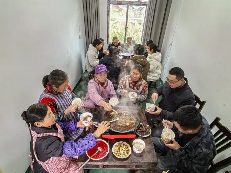 桌上的菜肴远不止一锅刨猪汤,胆水点制的花豆腐,配上柴火烤焦的辣椒、花椒、木姜子制成的蘸水,麻辣鲜香一应俱全。大人们围坐在一起,端起盛满酒的酒杯边喝边聊,张家说今年的稻谷收成不错,陈家谈着明年要扩大茶叶种植,欢声笑语、碰杯声、谈笑声交织在一起,构成了最动人的乡村交响。“这个年味越来越浓了,尤其在这三九寒天,我们土家人都喜欢吃这个刨猪汤,左邻右舍一起吃个团圆饭,就是感觉到一个亲热和睦,来,大家一起喝一杯,干杯!”在杨柳镇白虎咀村,村民吴彪的年猪饭也同样进行着,菜过五味他又一次起身,高举酒杯,众相邻纷纷响应,清脆的碰杯声在山谷间回荡。