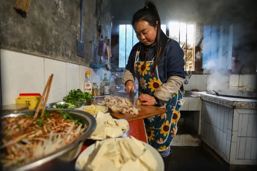 杀猪匠的手艺是这场盛宴的第一道保障:猪毛刨得干干净净,五脏六腑清洗得毫无异味,分割猪肉时刀工精准,肥瘦相间的五花肉、鲜嫩的猪肝、肥厚的肥肠被分门别类码在案板上,还带着牲畜体温的新鲜食材,是刨猪汤最动人的底气。土家妇女们早已围拢过来,手脚麻利地处理着食材,猪肝顺着纹路切成均匀薄片,刚接的猪血加少许盐温水搅拌凝结成块,再从自家菜园里拔来带着晨露的白菜、切好自制的酸辣椒与酸茄子,灶台边很快堆满了五颜六色的食材,一场味觉盛宴即将拉开序幕。