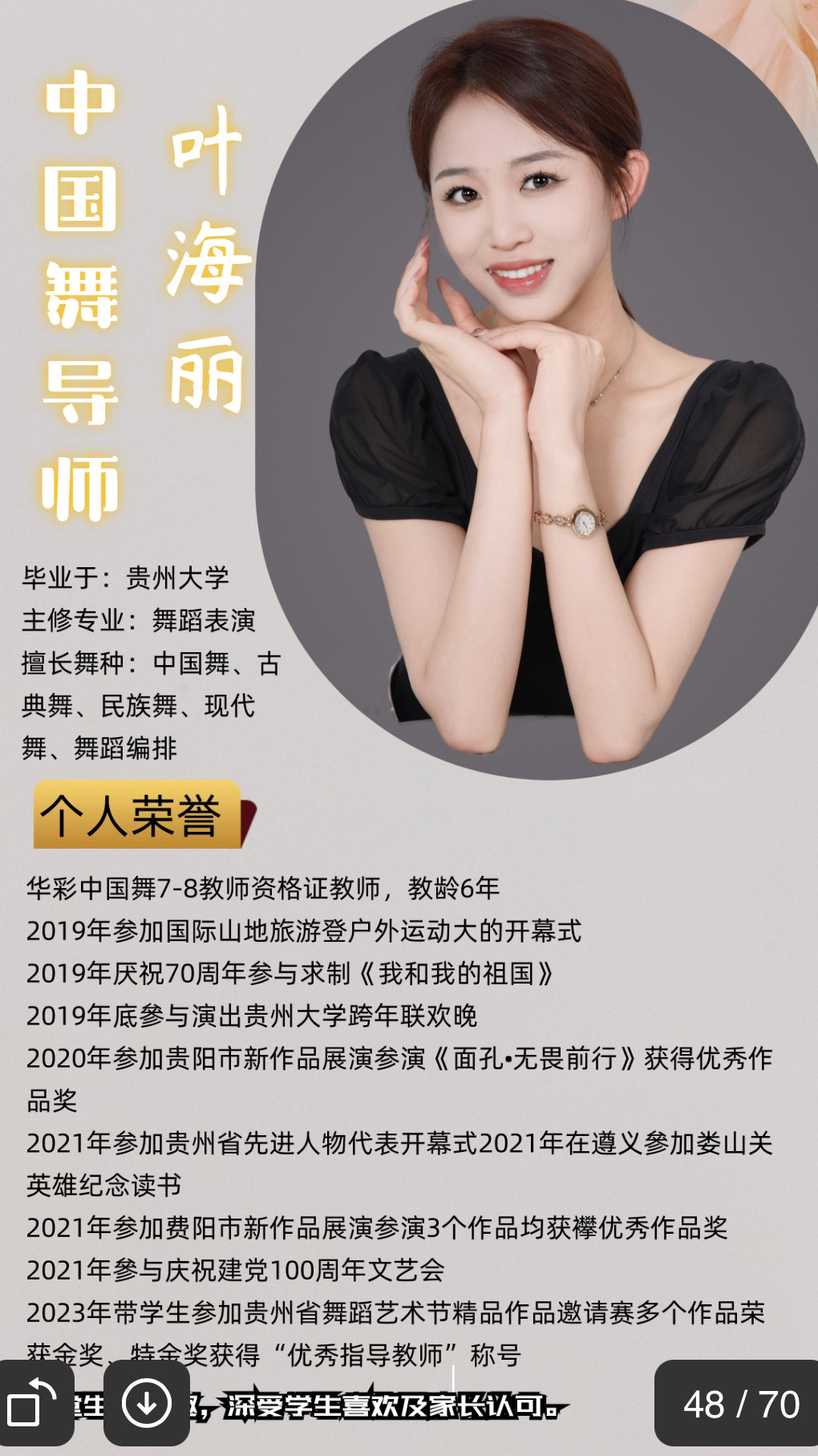 教育特色:是一家专门做舞蹈的教育培训,有自身独特的教学课程,课程体系由贵州大学教师编创,包含基本功,形体训练,以及国学文化,民族文化及非遗文化,同时也是贵州省首家全息课程教学方,教师均为专业舞蹈院校毕业,有着强大师资。教师团队能力强,教风明快活泼。多年来,我们一‘直致力于学生学习能力的开发和培养。