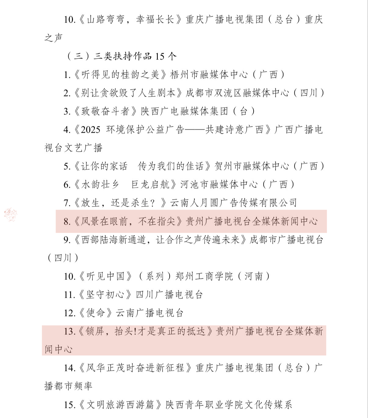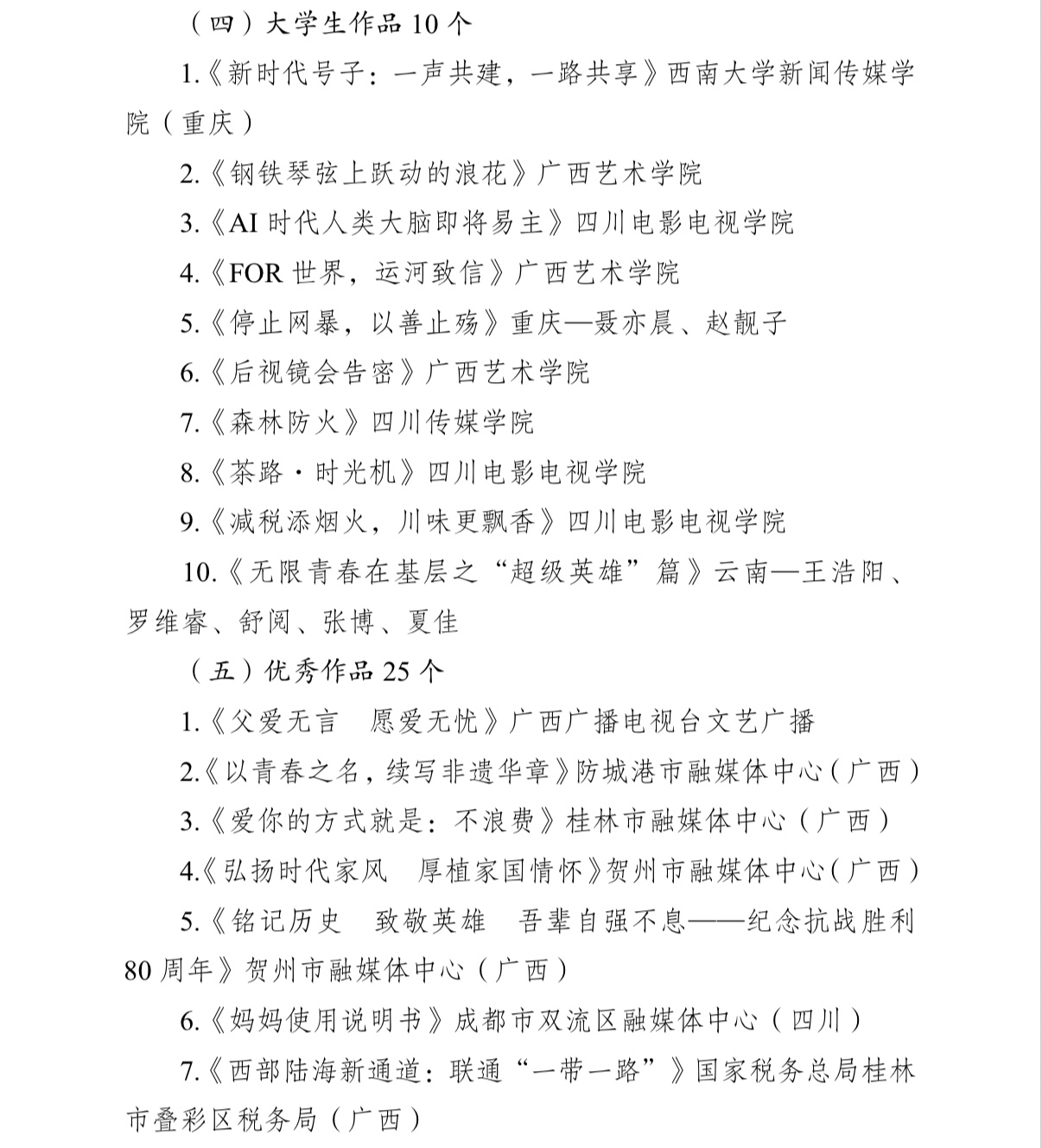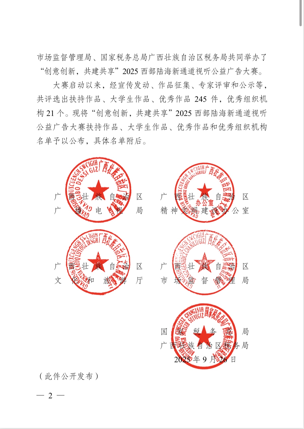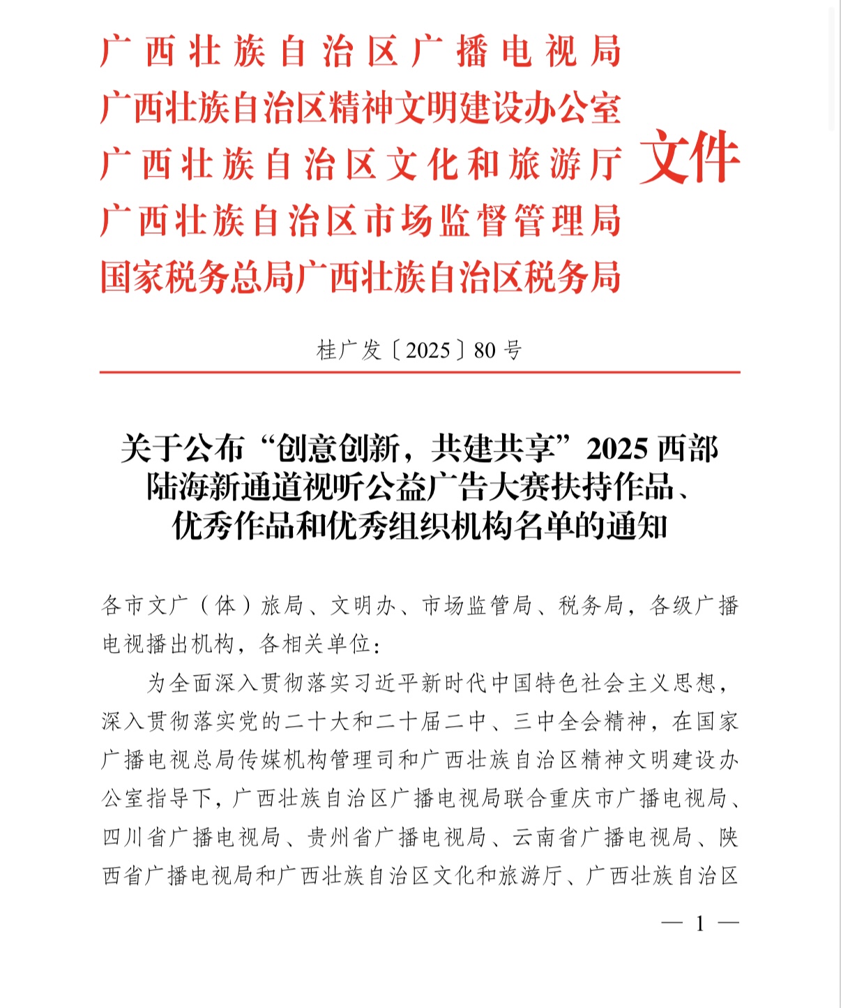 近日,由国家广播电视总局传媒机构管理司指导,广西、重庆、四川、贵州、云南、陕西六省广播电视局联合主办的“创意创新,共建共享”2025西部陆海新通道视听公益广告大赛评审结果揭晓。大赛启动以来,经宣传发动、作品征集、专家评审和公示等,共评选出扶持作品、大学生作品、优秀作品 245 件,优秀组织机构 21 个。
