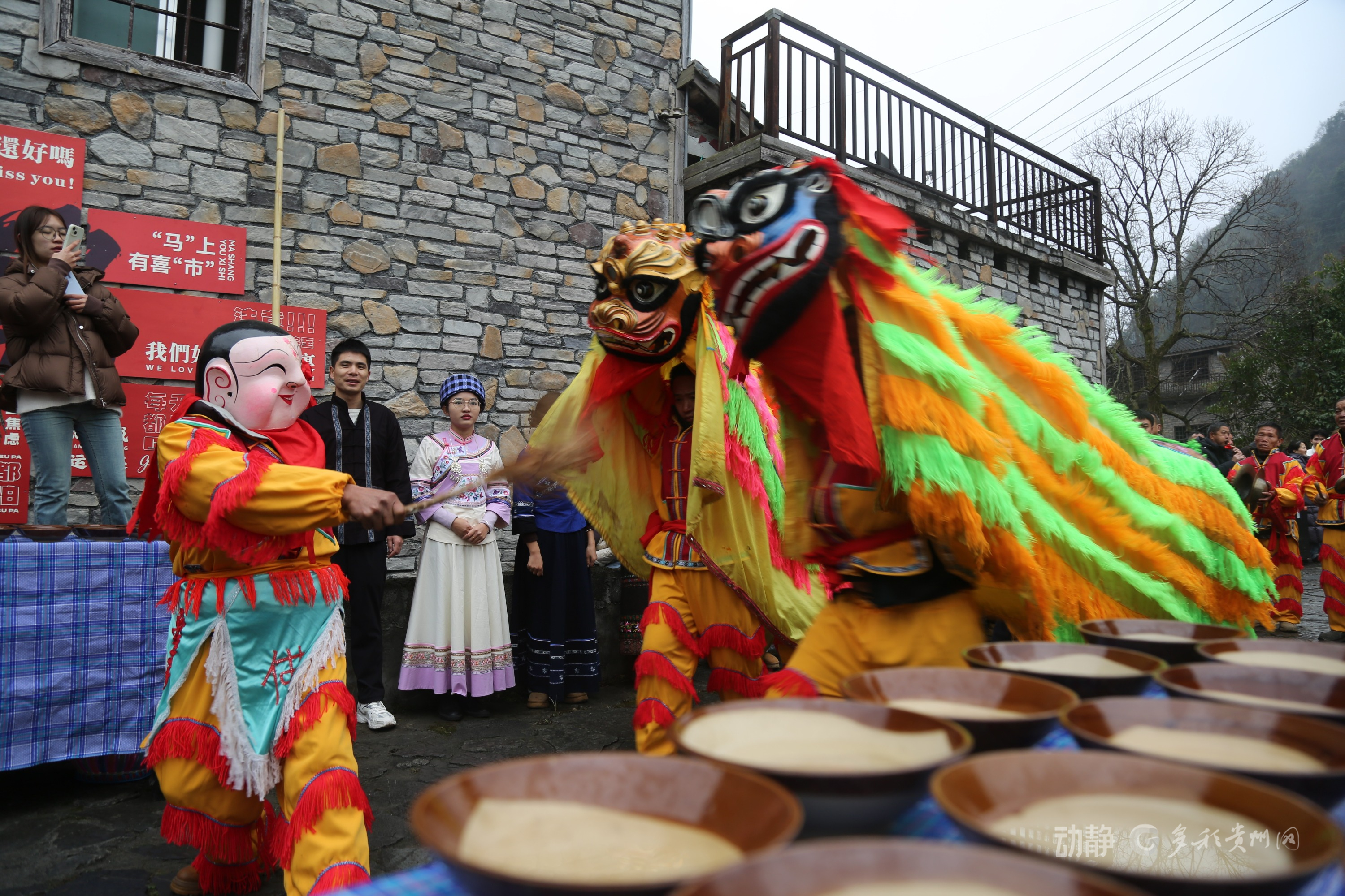 古寨村民身着盛装,用美酒、唢呐、狮舞、庖汤肉等迎接各地嘉宾。
