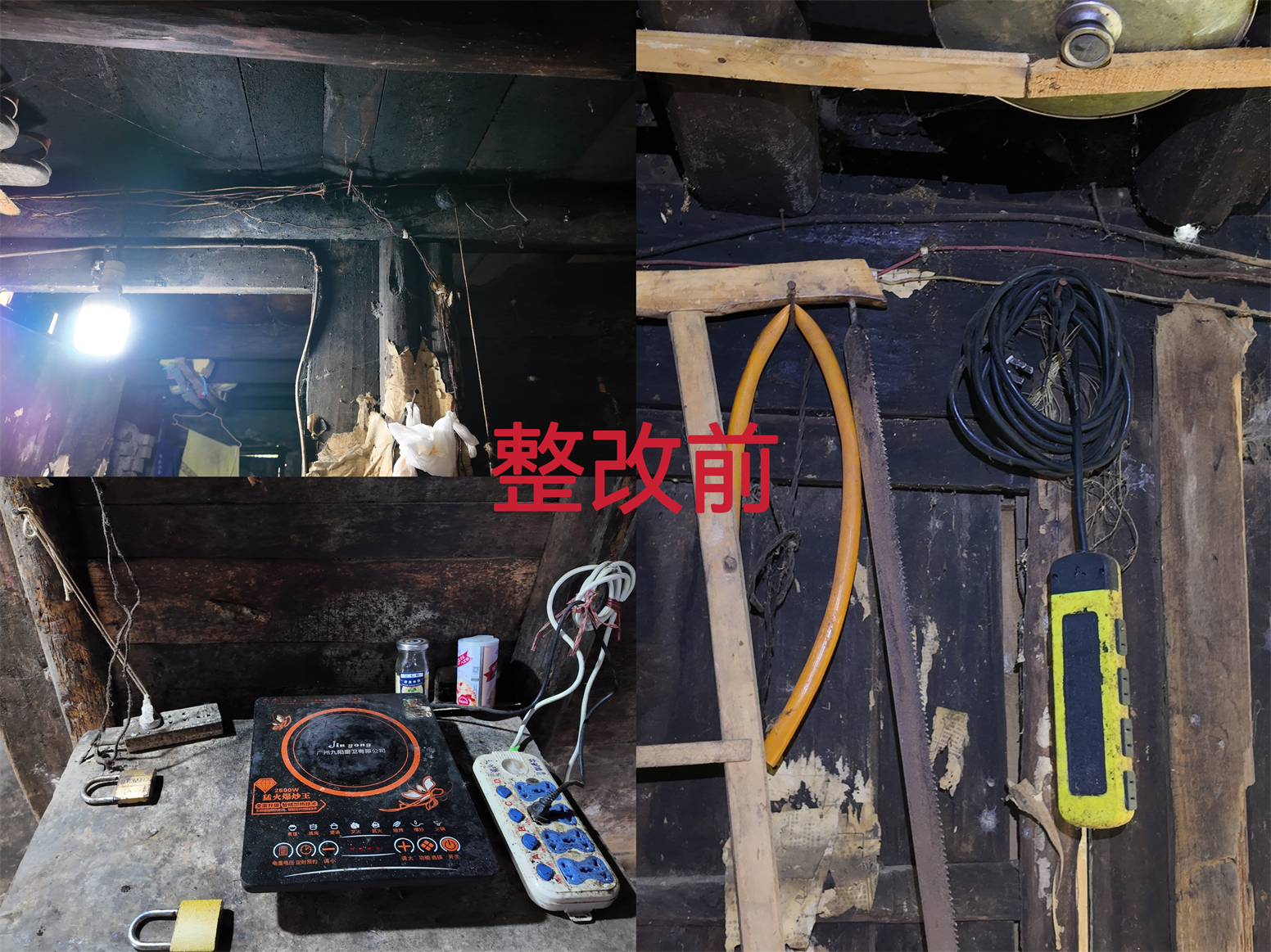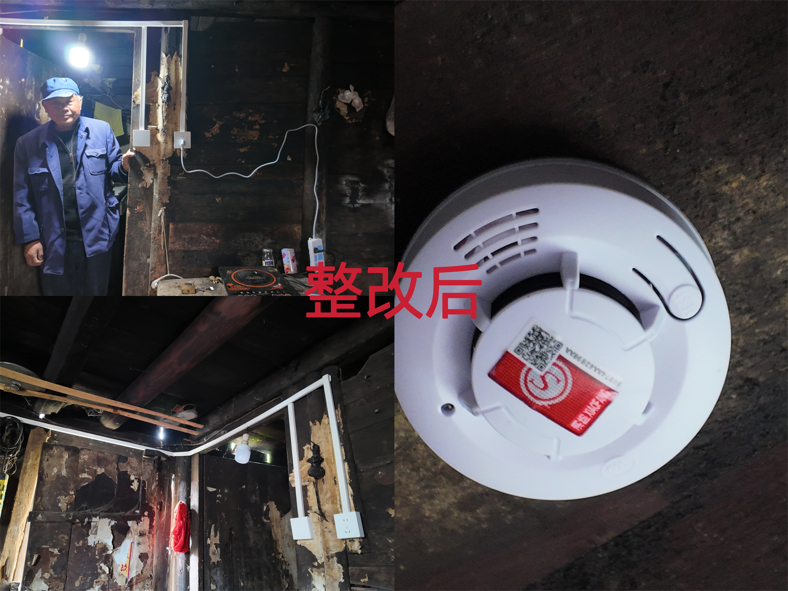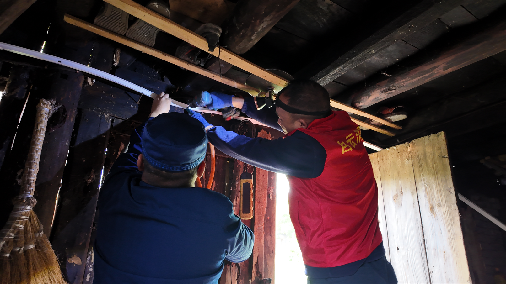 杨一荣老人的房屋已有七十余年历史,为典型的木质结构建筑,屋内木质房梁、楼板裸露,原有电气线路杂乱缠绕在木质构件上,线路老化、裸露、乱拉乱接、使用不合格插线板等问题突出,加之房屋耐火等级低,一旦发生线路短路,极易引发火灾,存在极大安全隐患。当天,电工师傅谯兆强同志一行严格按照相关技术规范,从电线该怎么布、选哪种线合适,到配电箱装在哪里、怎么做好接地保护,每一步都反复琢磨、合理规划,既保证老人平时用电方便,更把房子的电气安全防护做到位,让老人用电更放心。