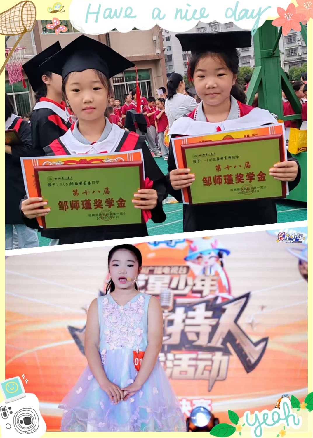 我的兴趣很多,学习也从未放松,成绩始终保持在班级前列。连续两年,我获得了“五好学生”“优秀小博士”“优秀小院士”等荣誉,还获得了“邹师谨奖学金”。我的世界是多彩的——除了歌唱和笔墨书香,我还热爱打篮球。在球场上,我是那个不知疲倦奔跑的小球员,汗水里洒满纯粹的快乐。我也在运动会上拿过“原地投篮冠军”和“短跑冠军”,还在学校的主持人竞赛中被评为“优秀小主持人”。