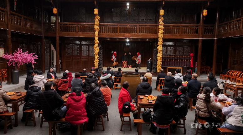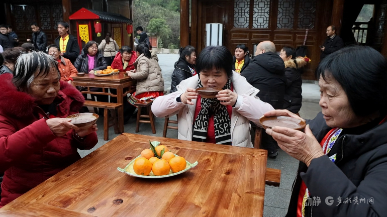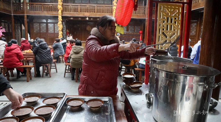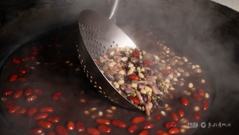 在印江土家族苗族自治县,人们精心搭配糯米、花生、红豆等食材,熬制土家腊八粥,邻里围坐分享,并伴有非遗傩戏表演。