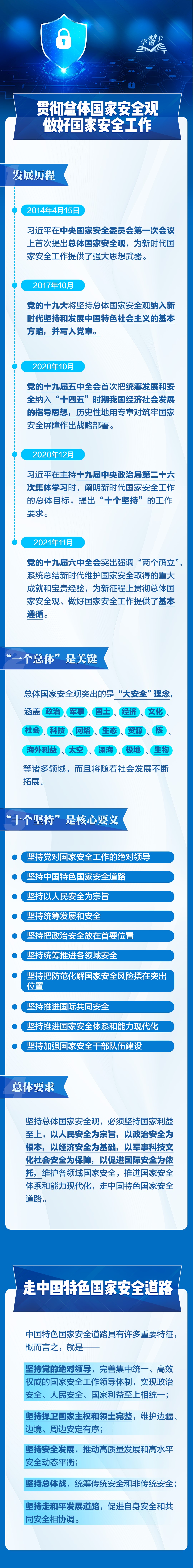 2014年4月15日,习近平总书记主持召开中央国家安全委员会第一次会议并发表重要讲话。他指出,我们要准确把握国家安全形势变化新特点新趋势,坚持总体国家安全观,走出一条中国特色国家安全道路。