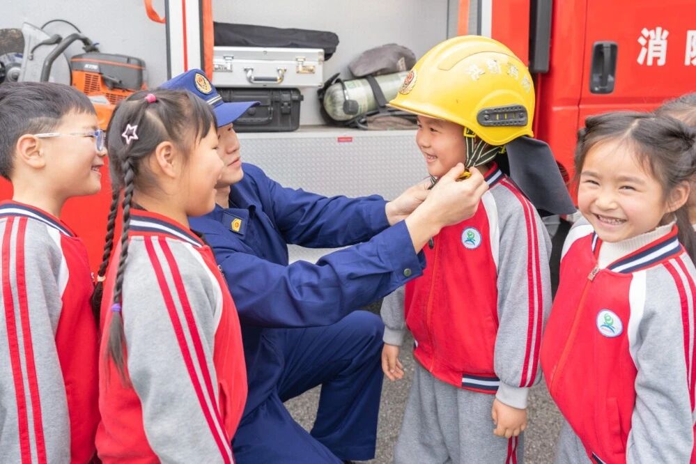 国家安全教育日来临之际,浙江省湖州市长兴县洪桥镇中心幼儿园联合洪桥镇新时代文明实践所开展“童心筑安全,护航共成长” 主题活动,提高孩子们安全防范意识。图为活动中消防人员带领孩子体验消防灭火设备。王徐超 摄