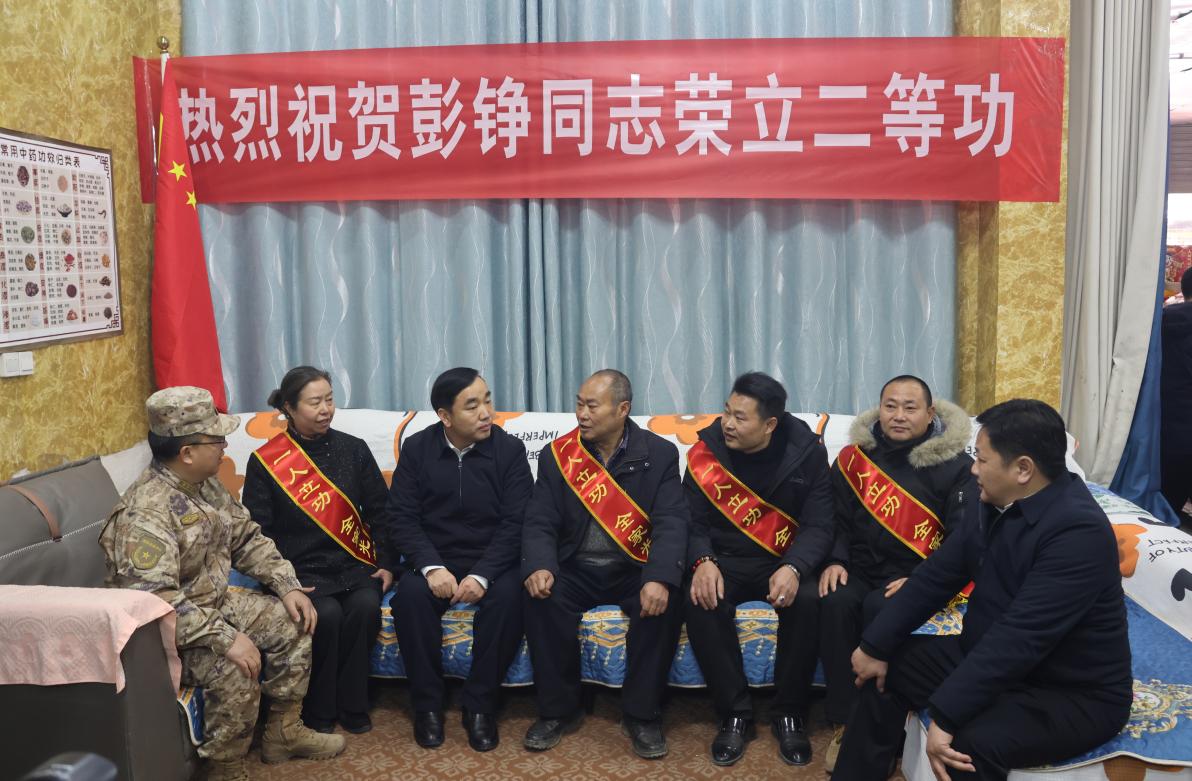 在现役军人彭铮家中,军地领导亲手将“二等功”喜报送到彭铮父母手中,并与他们亲切交谈,详细询问家庭生活情况,感谢他们为国家、为部队培养了优秀人才。彭铮的父母表示,感谢党委、政府的关心关怀,作为军人家属,今后将继续做好坚强后盾,鼓励儿子安心服役、再接再厉,再立新功,为家乡增光添彩。