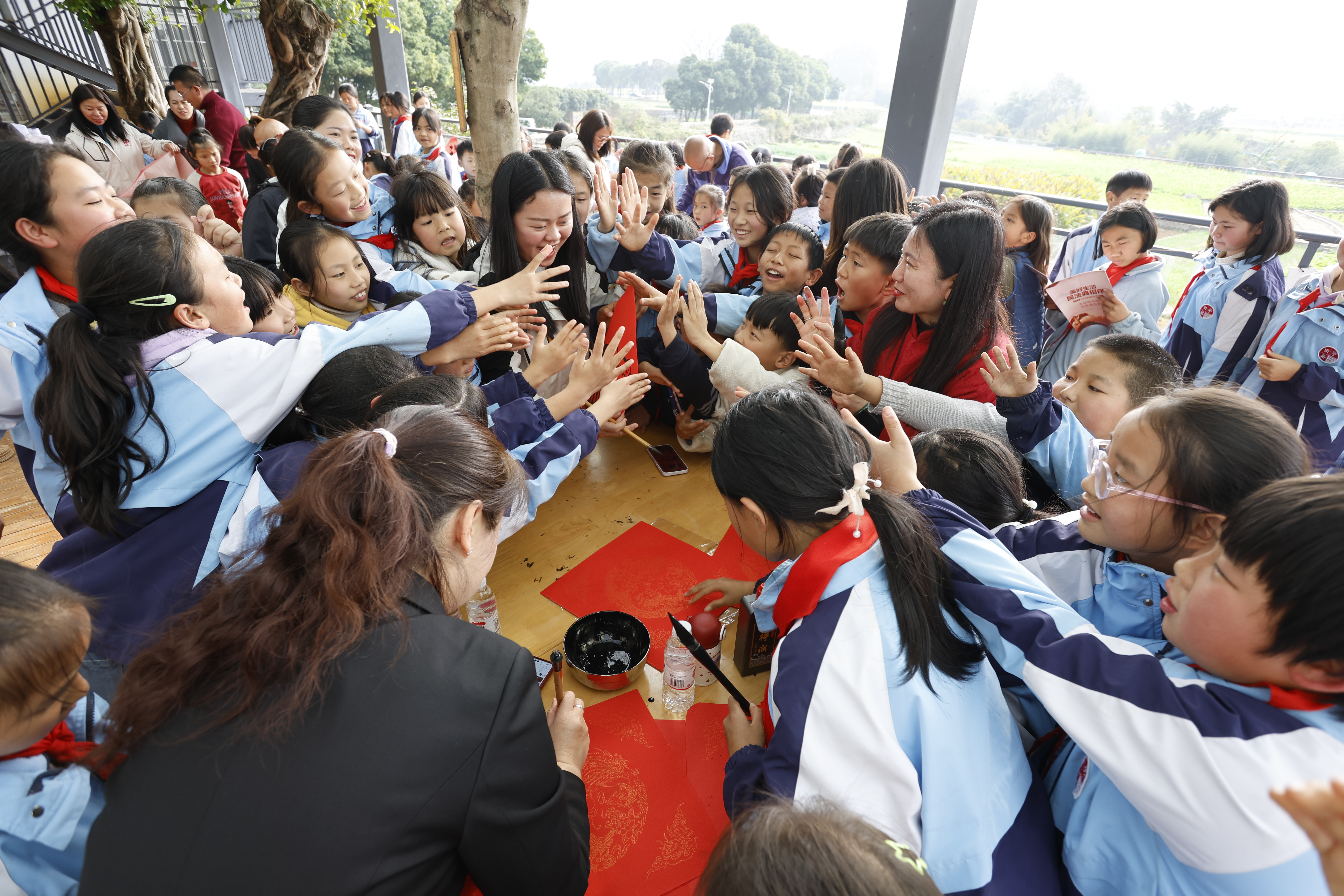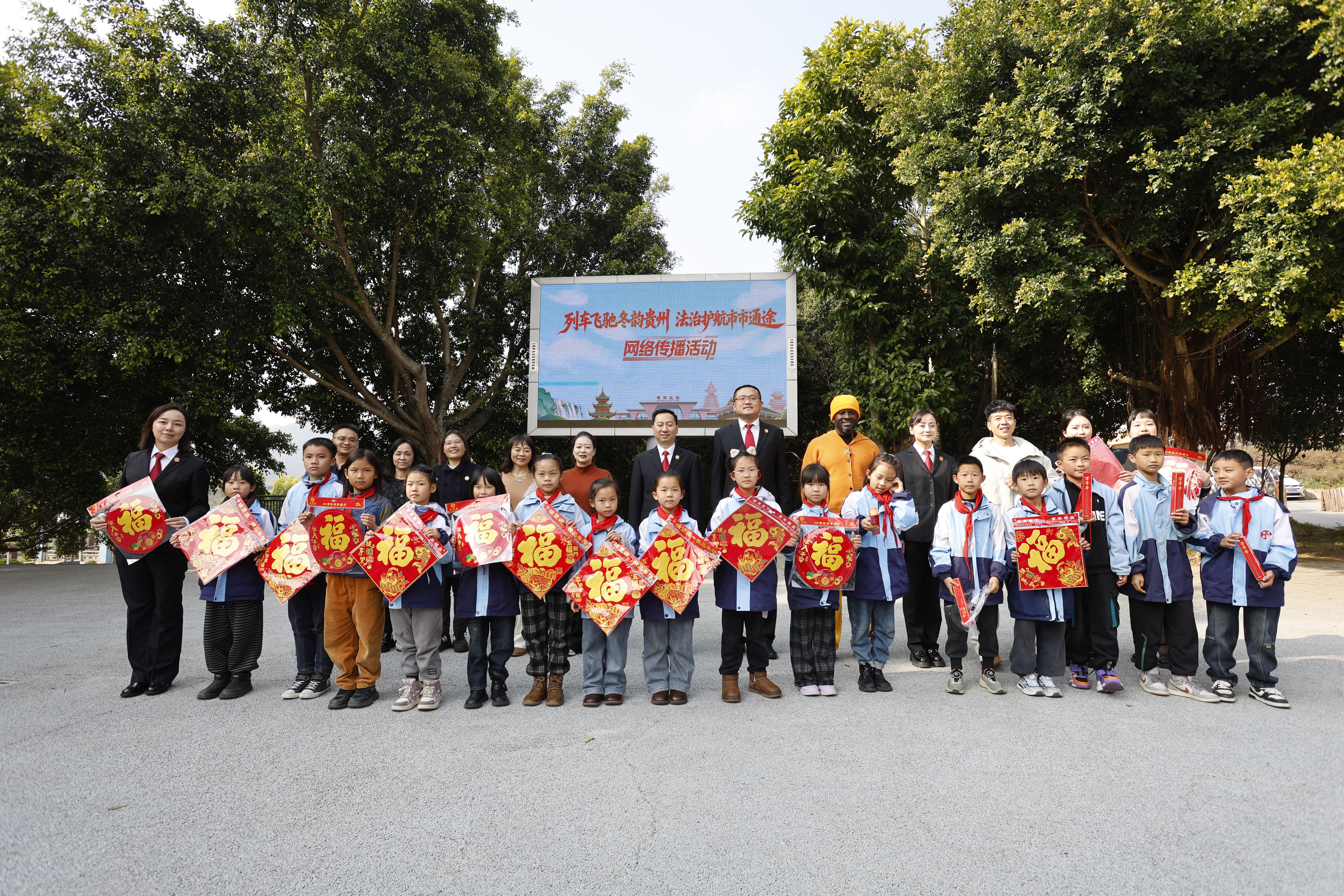 抵达兴义后,活动走进兴义市田字格万峰林民族实验学校,为150余名师生带来专场法治课。选择该校作为活动站点,既因兴义高铁开通带来的交通变迁,也源于学校独特的地方与民族特色,实现了“交通赋能+法治护航”的双重效应。课堂上,贵阳铁路运输法院及黔西南中院的法官们,分别围绕法律实践应用、寒假安全防护、校园霸凌防范等主题展开讲解,引导同学们学会用法律武器保护自身合法权益。学校副校长梁州感慨,这场及时的普法活动为未成年人健康成长筑牢了法治屏障。活动尾声,采访团还与同学们共同泼墨书写新春祝福,让法治理念与传统文化相得益彰。