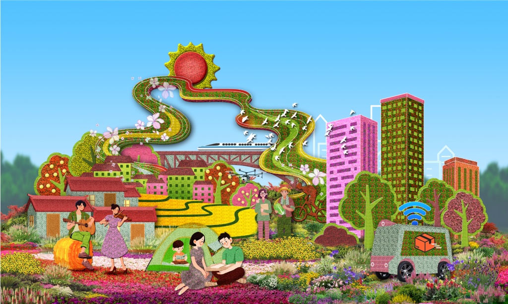 东单东南角“共同富裕”花坛,以欣欣向荣的城乡融合发展为场景,描绘了中国式现代化全体人民共同富裕的美好蓝图。