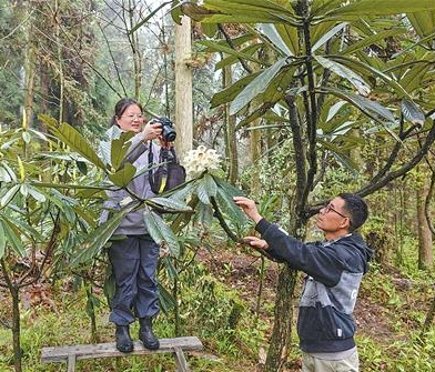 在华西亚高山植物园,研究人员在记录凸尖杜鹃开花的状态。