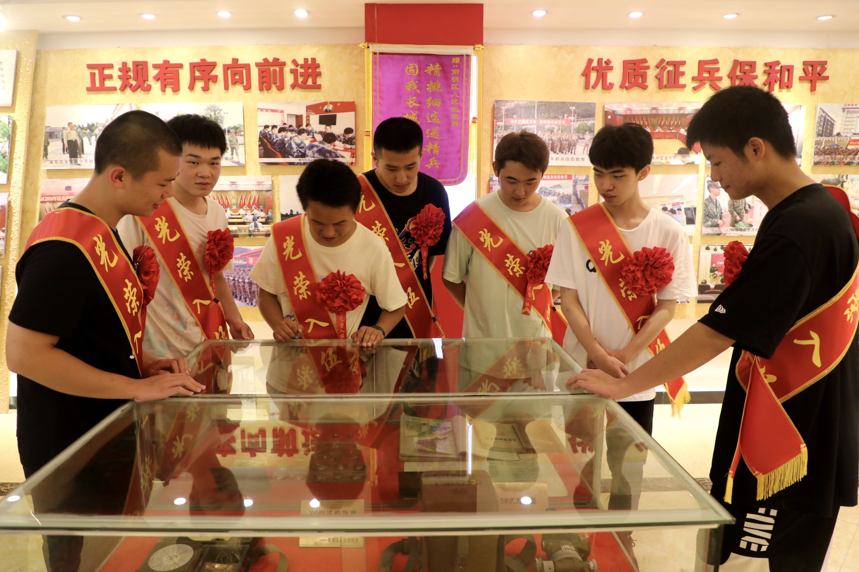 活动中,新学员们肩披“光荣入伍”绶带、胸戴大红花,精神饱满、意气风发。在人武部官兵的带领下,依次参观党史军史纪念馆和荣誉室,通过实物展陈和沉浸式体验,进一步筑牢国防意识,为即将开启的军旅生涯打牢思想根基。