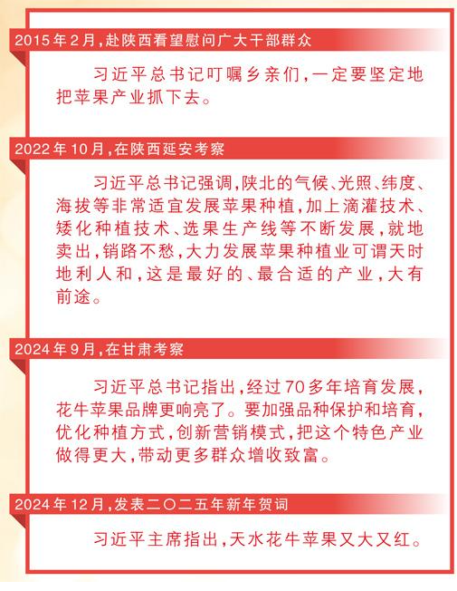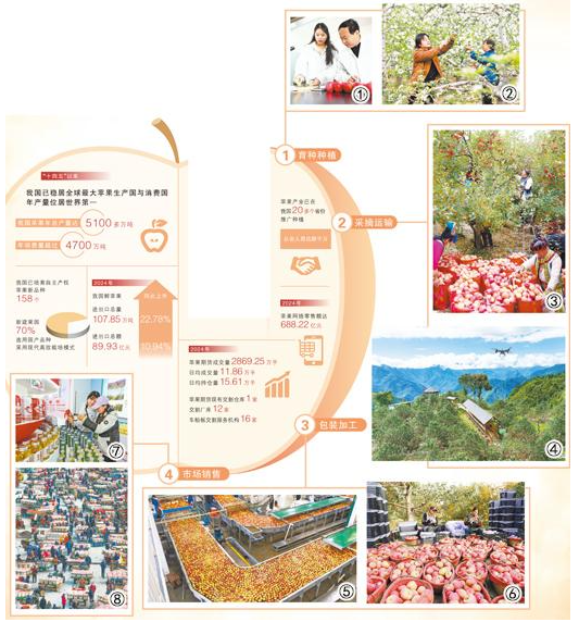 图①:在陕西白水县,西北农林科技大学白水苹果试验站站长高华(右)和硕士研究生于萌正在检测苹果糖度。新华社记者 李一博摄 图②:在山西临汾市襄汾县西贾乡三盛村,果农对苹果园进行疏花作业。 李现俊摄(影像中国) 图③:四川茂县南新镇安乡村村民在采摘苹果。兰红光摄(新华社发)图④:在湖北恩施土家族苗族自治州巴东县沿渡河镇小神农架村骄顶寨高山苹果种植基地,无人机在空中吊运采摘的苹果。焦国斌摄(人民视觉)图⑤:贵州威宁彝族回族苗族自治县产投生态果业有限公司,工人正在自动化设备生产线上操控设备,对苹果进行清洗、测色、分级。罗喜贵摄(影像中国) 图⑥:新疆阿克苏地区阿瓦提县塔木托格拉克镇吐格贝希村的果园里,果农正忙着分拣、包装“冰糖心”苹果。包良廷摄(影像中国)图⑦:在甘肃平凉举行的2025年中国苹果产销峰会暨静宁苹果招商推介大会上,市民游客参观并拍照。 郑 兵摄(影像中国)图⑧:山东招远市毕郭苹果批发市场,交易火爆。乔光先摄(影像中国)数据来源:中国苹果产业协会、国家苹果产业技术体系《中国苹果产业发展报告》