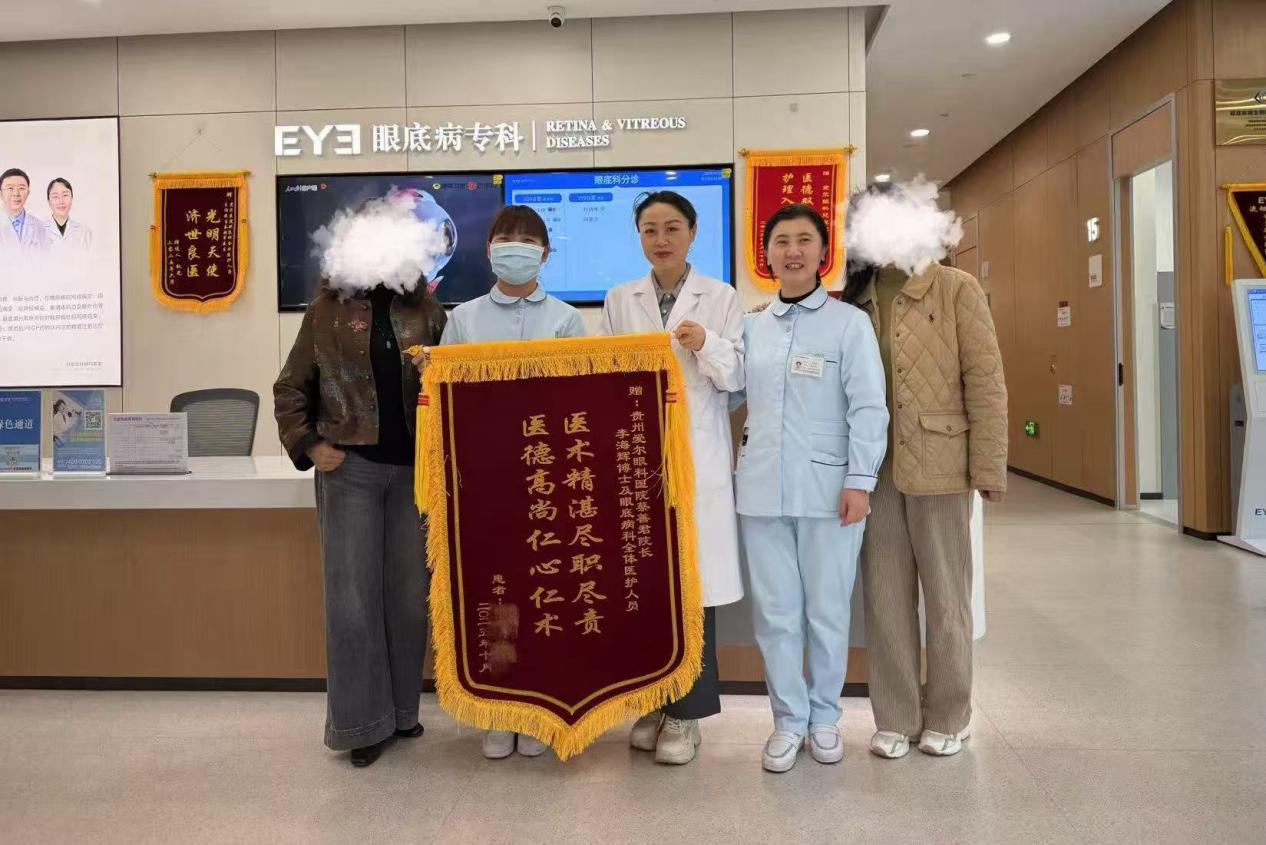 贵州爱尔眼科医院眼底病科收获了一份特殊的“礼物”——写着“医术精湛尽职尽责 医德高尚仁心仁术”的感谢锦旗。赠送锦旗的何女士(化名)和王女士(化名),因高度近视病理性黄斑病变的治疗中相熟,又在医护团队的精心治疗下改善视界。这面锦旗不仅承载着患者深深的感激,更见证了医患携手战胜复杂眼病的动人历程。