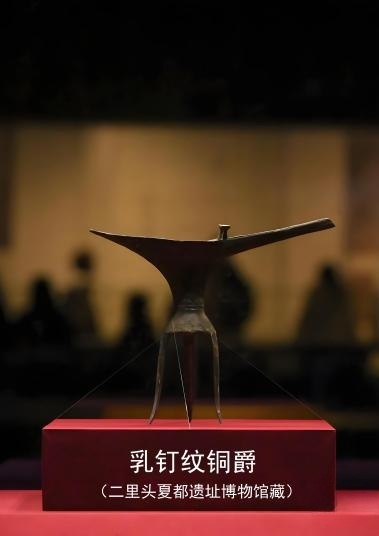 在二里头夏都遗址博物馆,藏着一件乳钉纹铜爵(图2)。它通高26.5厘米,束腰平底,三锥足细长挺拔,腹部的乳钉纹像颗颗星辰,在灯光下闪烁着4000年前的光芒。作为目前发现的最早青铜爵之一,它不仅是酒器,更是权力的象征。