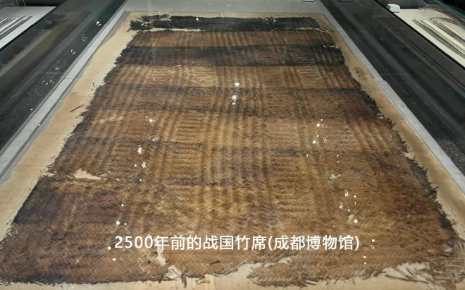 最早的“席”出现在《壹是纪始》¹中提及的“神农作席荐”,可见早在新石器时期,席的编织与加工就已经得到发展。浙江河姆渡遗址发现了7000多年前的“席”,陕西西安半坡遗址也曾出土过距今6000多年的芦苇编织席残片;而成都博物馆所藏2500年前的竹席(图2),和今天的竹席简直一模一样。
