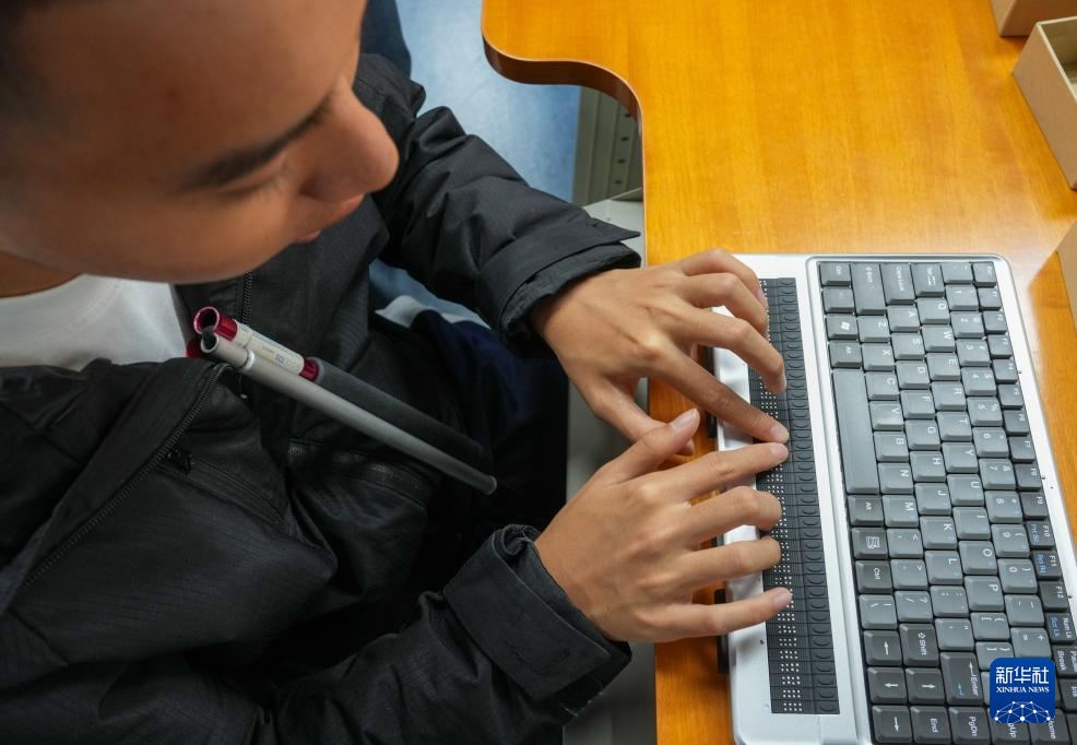 10月13日,视障人士在发布会后,体验有点显器的盲文笔记本电脑。新华社记者 才扬 摄