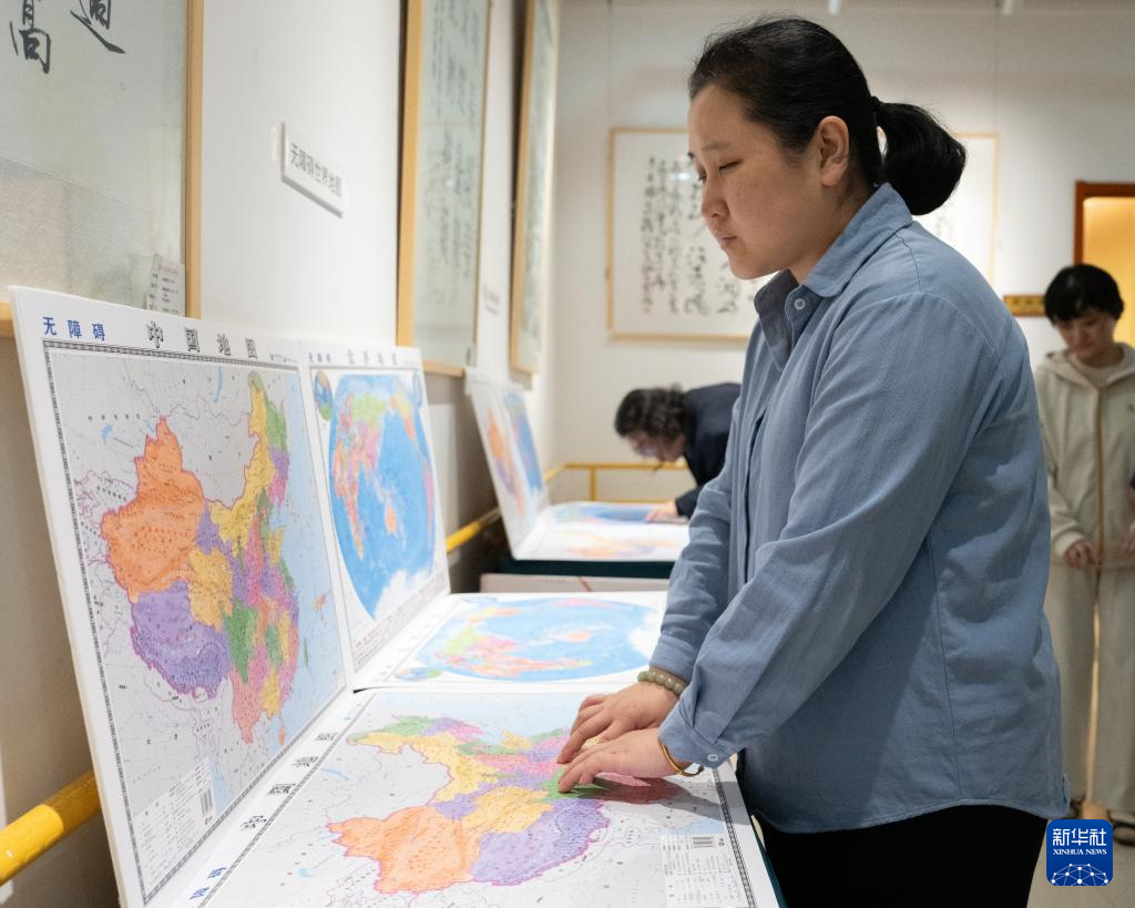 10月13日,视障人士在发布会后,触摸盲文版《无障碍中国地图》。新华社记者 才扬 摄