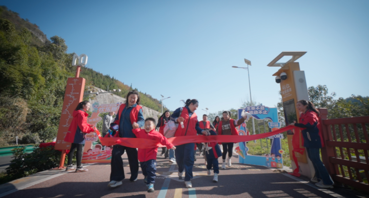 随着发令枪响,亲子队伍沿着智慧赛道奋勇向前,赛道瞬间化作欢乐的海洋。沿途青山如黛、溪水流淌,原生植被与智能喷淋、心率监测等设施相映成趣,构成一幅“生态+智慧”的优美画卷。家长们或牵着孩子的小手缓步前行,沿途讲解梵净山生态知识;或背起年幼的孩童大步奔跑,后背的小不点紧紧搂着家长脖颈,清脆的笑声在山谷间久久回荡;趣味关卡前,亲子默契配合、携手闯关,加油声、欢呼声此起彼伏,成为赛道上最动人的旋律。“妈妈加油!我们马上到终点啦!”“爸爸再加把劲,我们能追上前面的队伍!”孩子们稚嫩而坚定地呐喊,为家长们注入了不竭动力。