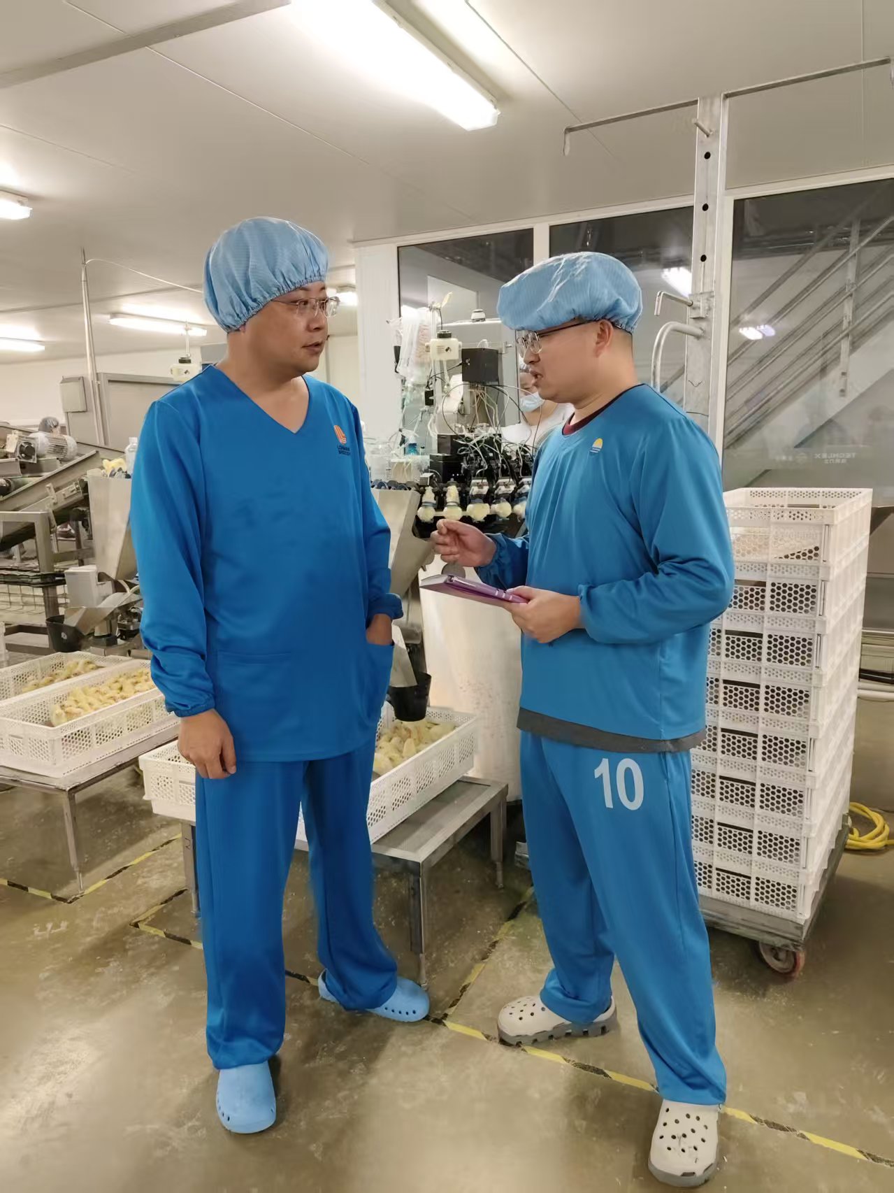 雷斌(左一)在生产车间与技术人员交流