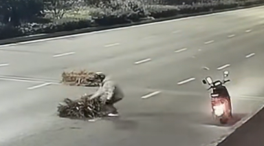 凌晨1时6分,一名骑车的驾驶人路过,他立即靠边停车,然后快速地将货物挪到路边后才离开。