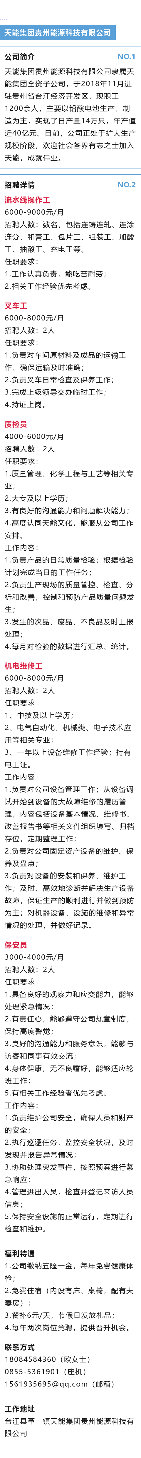 天能集团贵州能源科技有限公司5岗招聘!月薪可达9000元!五险一金、免费住宿!