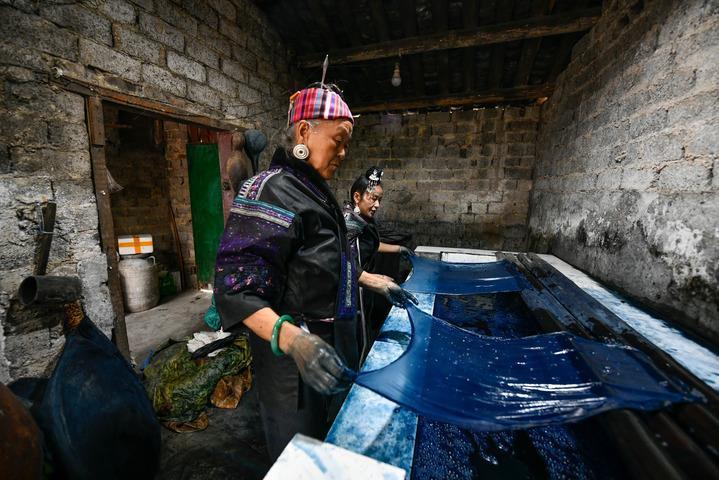 在贵州省台江县萃文街道仰黎坊,苗绣传承人潘玉珍(前)与女儿张艳梅在染布(5月30日摄)。新华社记者 杨文斌 摄