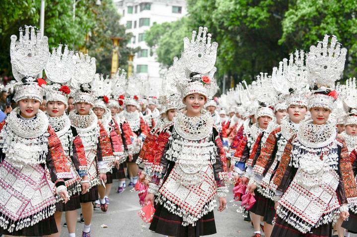 苗族姑娘们在参加贵州省台江县苗族姊妹节盛装巡游(2021年4月25日摄)。新华社记者 杨文斌 摄