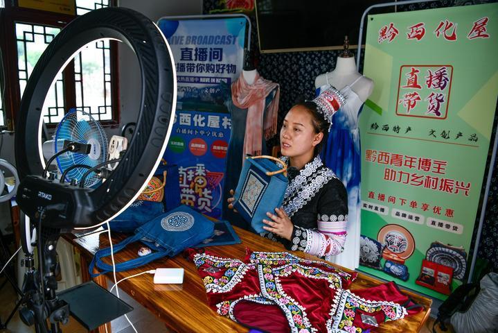 绣娘杨文丽在贵州省黔西市新仁苗族乡化屋村的文创产品直播间推介苗绣文创产品(5月30日摄)。新华社记者 杨文斌 摄