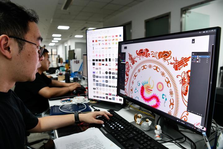 多彩贵州文化数据平台有限公司的设计师在电脑上做苗绣矢量化提取(6月1日摄)。新华社记者 杨文斌 摄