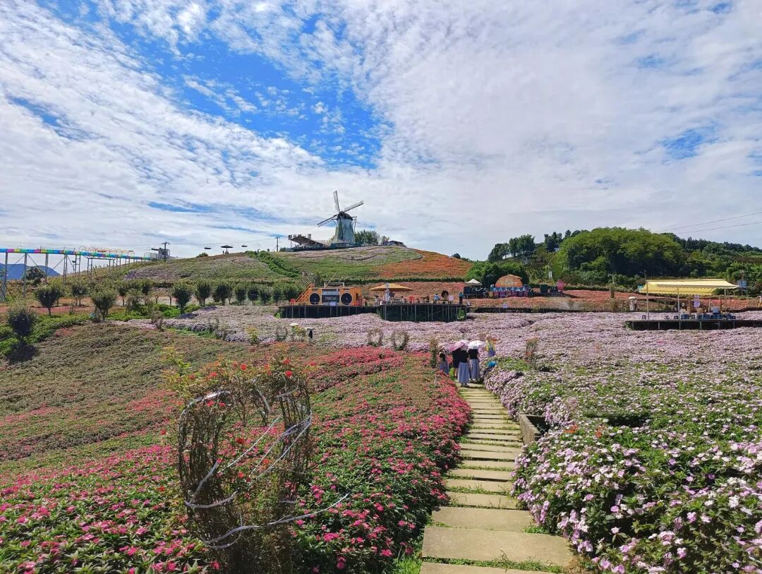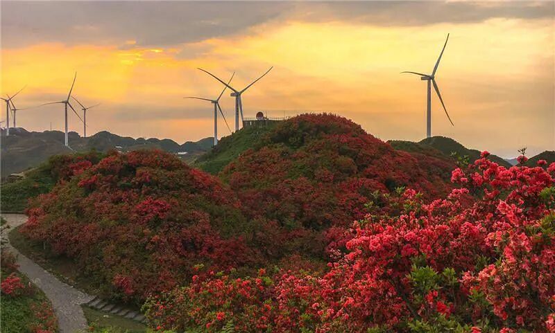 4月中下旬,紫红、粉白的小叶杜鹃铺满山坡,与巨型风车群相映成趣。山顶视野开阔,可俯瞰云海翻涌,夜晚可住星空木屋,枕花香入眠。