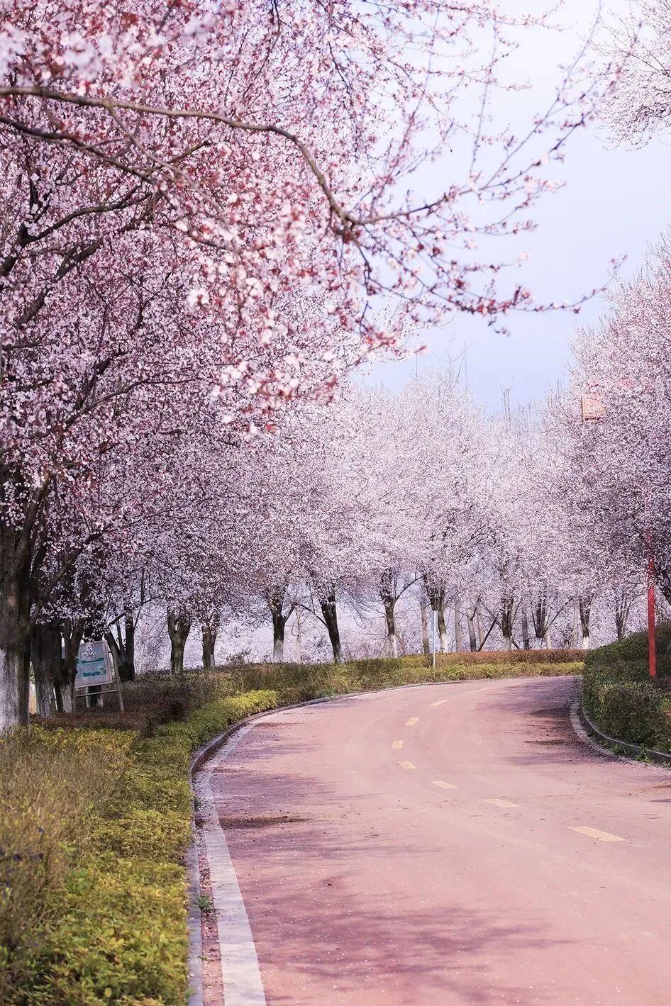 一条悠长蜿蜒的花道,在四月春风的缱绻中,把云间粉蒸的霞,堆满了树桠的枝和枝叶的缝,如缀满锦瑟的年华,如婉约缤纷的清梦。