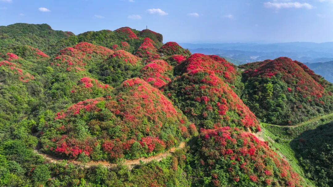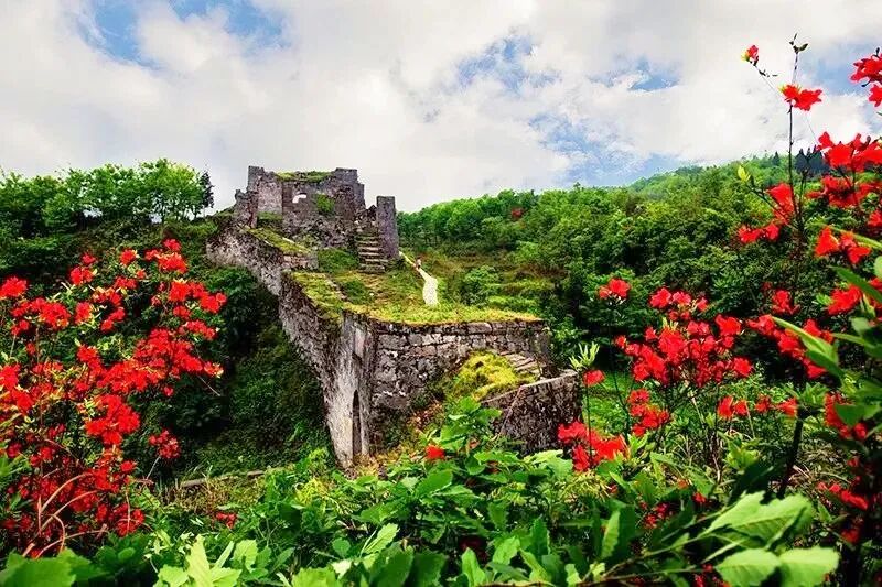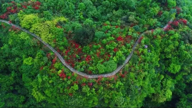 山路蜿蜒如玉带,大片醒目的殷红打破了山间的沉静。宛如朱砂点点,藏在深山之间自顾自热烈盛放的杜鹃花,靓丽而张扬,无声的宣告着独属于海龙屯的美。