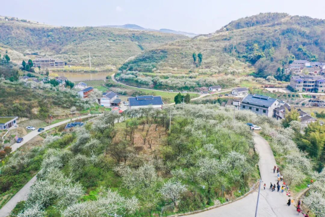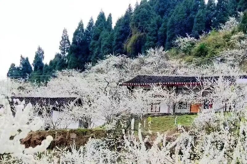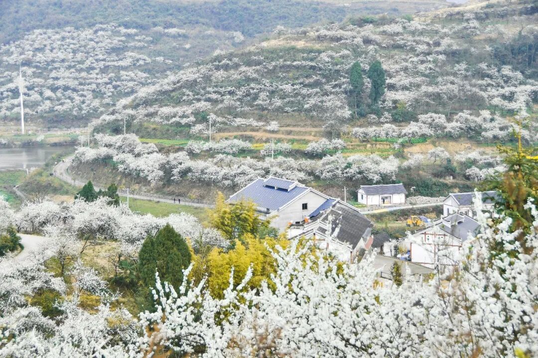 漫山李花竞相绽放,花海如雪,结合山地田园风光,适合摄影爱好者创作。