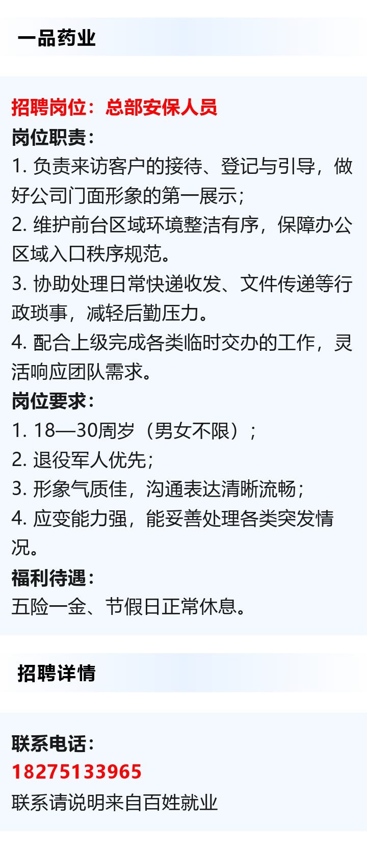 【知名企业】一品药业招聘总部安保人员!五险一金!