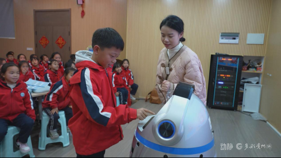 在黔东南苗族侗族自治州从江县,这所小学的学生在老师的引导下,正通过AI指令模块指挥机器人前进、转弯,让孩子们在实操中了解编程原理。