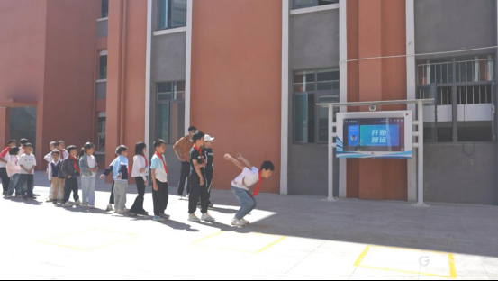 在六盘水市盘州市第十二小学,孩子们正借助AI智慧体育设备进行立定跳远测试。