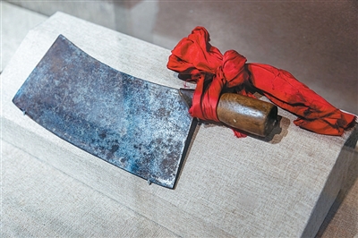 “山河重整”展区陈列着一把生锈的菜刀,刀刃上有几处缺口,看起来平平无奇,却是山西博物院藏国家一级文物——这是武乡县凹里村农民王贵女和段满清母子俩杀敌用的刀。