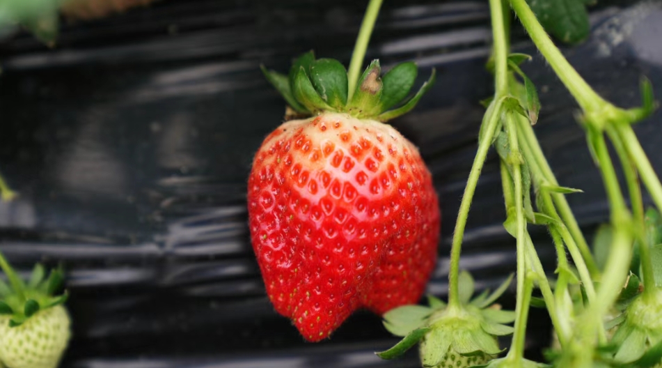 走进草莓大棚内,浓郁的果香味扑鼻而来,一垄垄绿色的草莓苗生机勃勃,一颗颗饱满红润的草莓从藤蔓中悄悄“探”出头来,让人垂涎欲滴。游客结伴而来,手提着塑料篮,在嫩绿的叶子间精心挑选成熟的草莓,欢声笑语飘荡在温暖的大棚里。