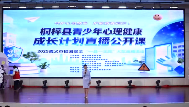 为深入贯彻落实国家、省、市关于校园安全工作的部署要求,全面展示桐梓县家校社协同育人的创新实践与成效,积极营造全社会关心、支持并参与学生心理健康教育的良好氛围,提升家长、学校及社会在心理健康方面的认知水平与素养,促进学生身心全面健康发展。2025年12月20日,以“守护心灵晴空 护航青春远行——青少年心理健康成长计划”为主题的遵义市校园安全“一县一主题”首场大型直播活动在桐梓县举行。