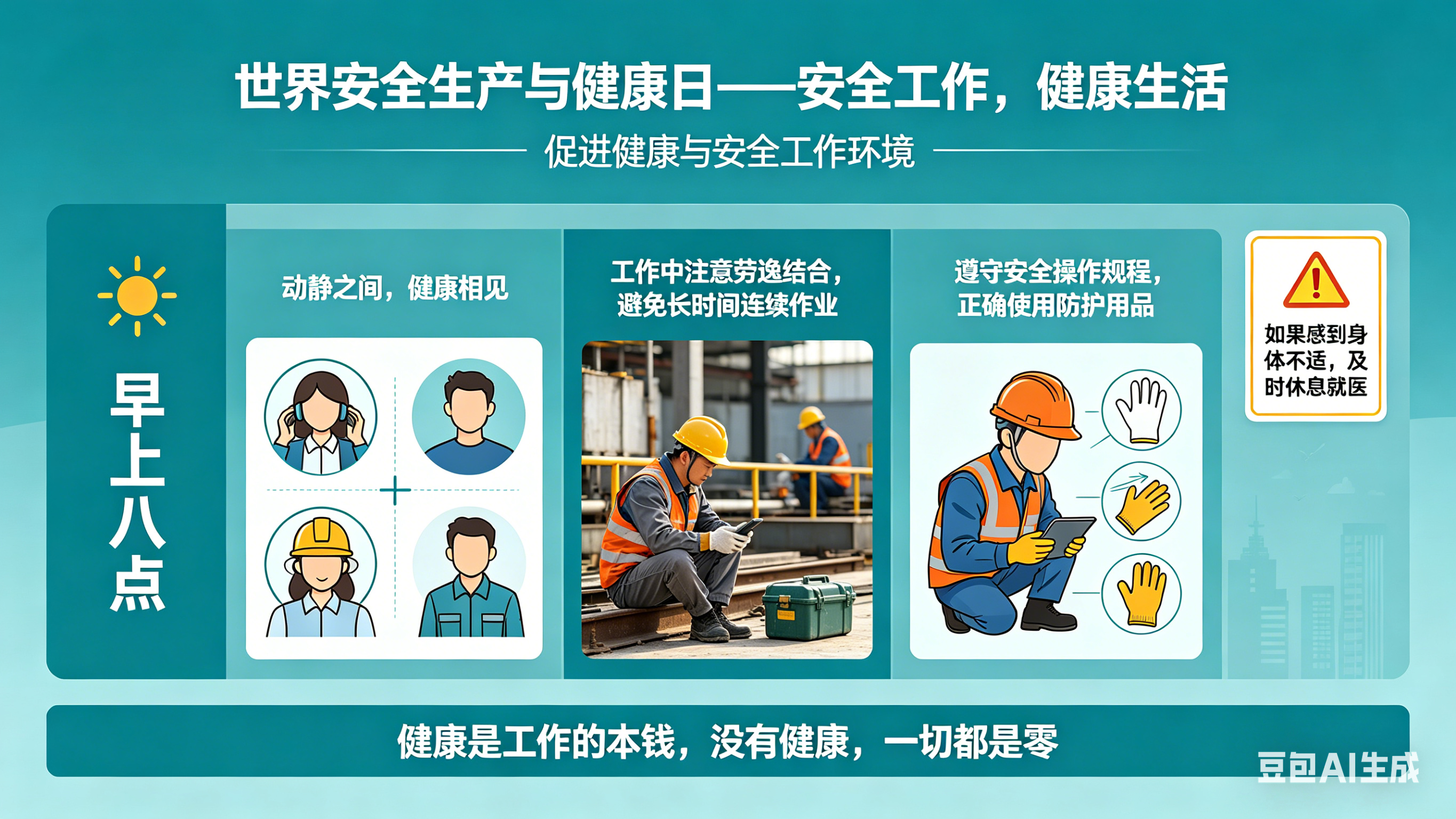 今天是世界安全生产与健康日,主题是“促进健康与安全工作环境”。无论您从事什么职业,安全都是第一位的。工作中注意劳逸结合,避免长时间连续作业;遵守安全操作规程,正确使用防护用品;如果感到身体不适,及时休息就医。健康是工作的本钱,没有健康,一切都是零。
