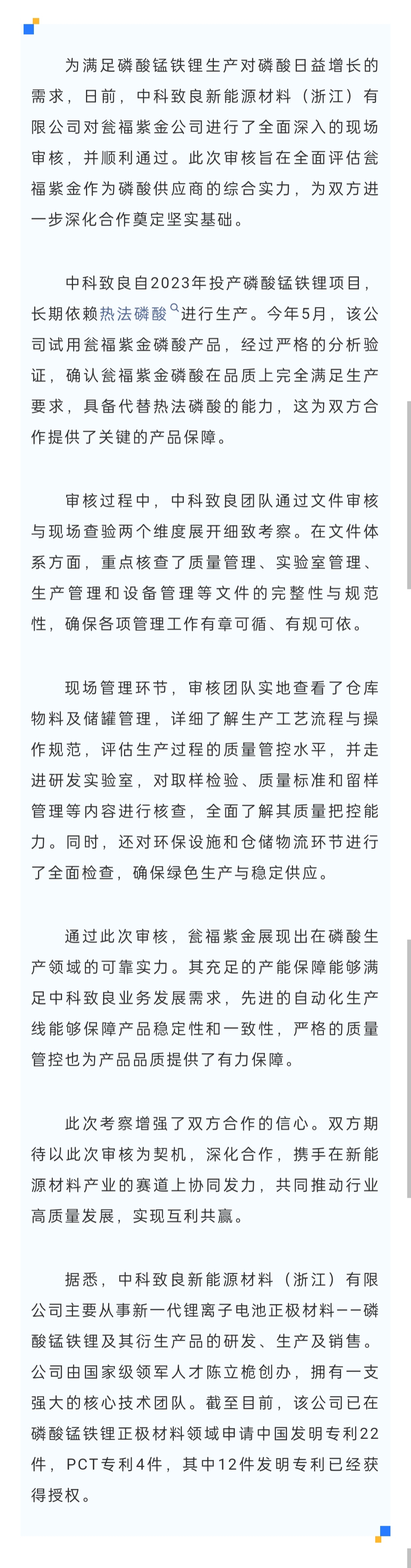 中科致良完成对瓮福紫金现场审核,磷酸供应合作迎来新突破