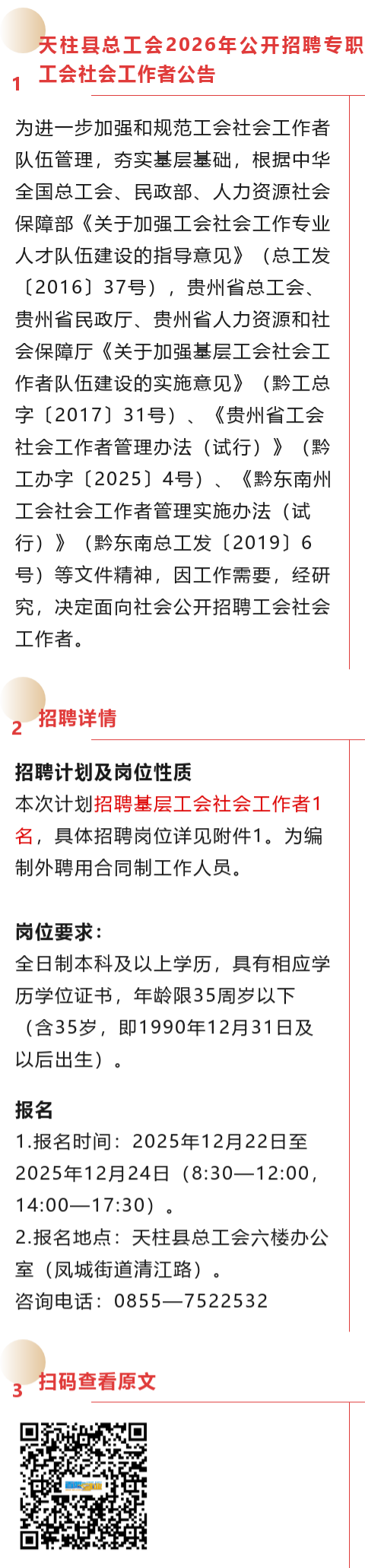 【政府机关】招聘基层工会社会工作者!报名时间:12月22日-12月24日!