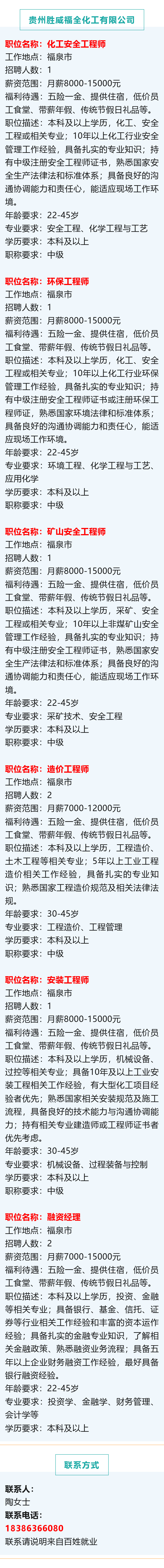 月薪7000~15000元!五险一金!提供住宿!贵州胜威福全化工有限公司招聘!