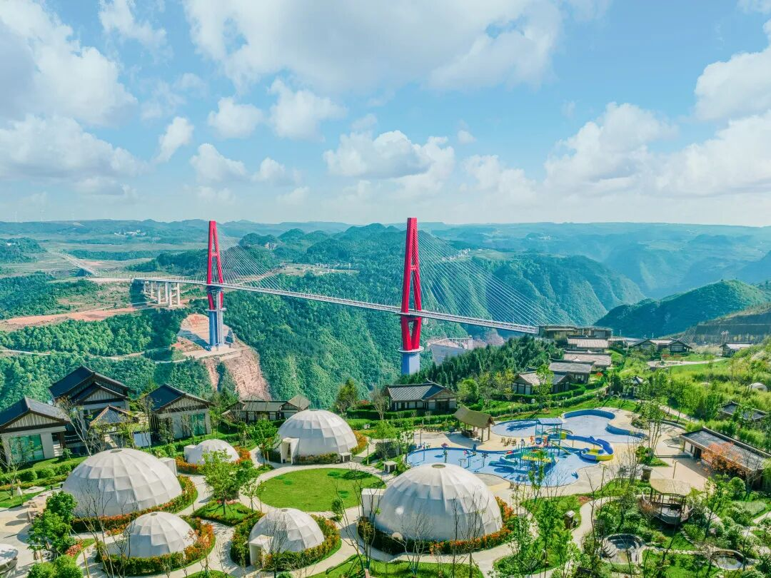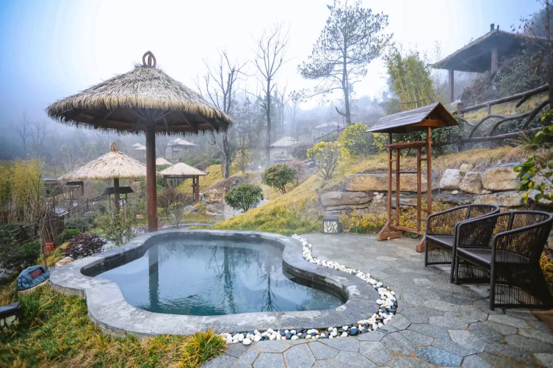 云从朵花温泉度假中⼼是综合型⼭地温泉度假中⼼。也是黔中地区目前规模较大、配套设施较完备的度假中心。度假中⼼拥有市场稀缺的⾼⼭峡⾕景观,远离城市喧嚣,周边⾃然⻛景秀丽,并紧邻世界第⼀的⾼⼭峡⾕景观斜拉桥朵花特⼤桥——⻰⾥河⼤桥。