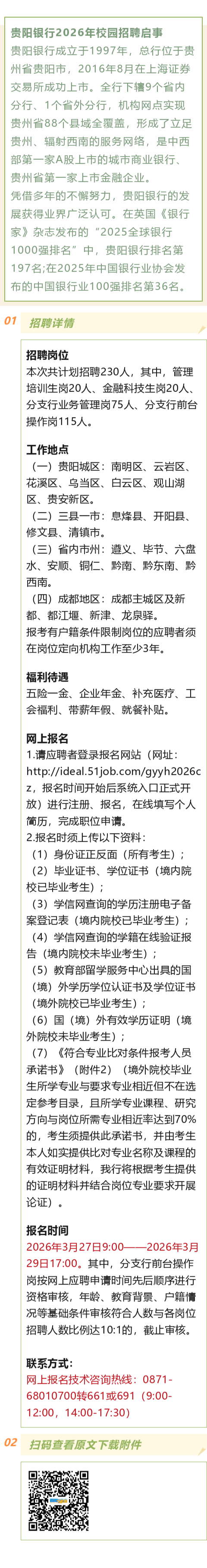 贵阳银行招聘230人!六险两金+带薪年假+就餐补贴!