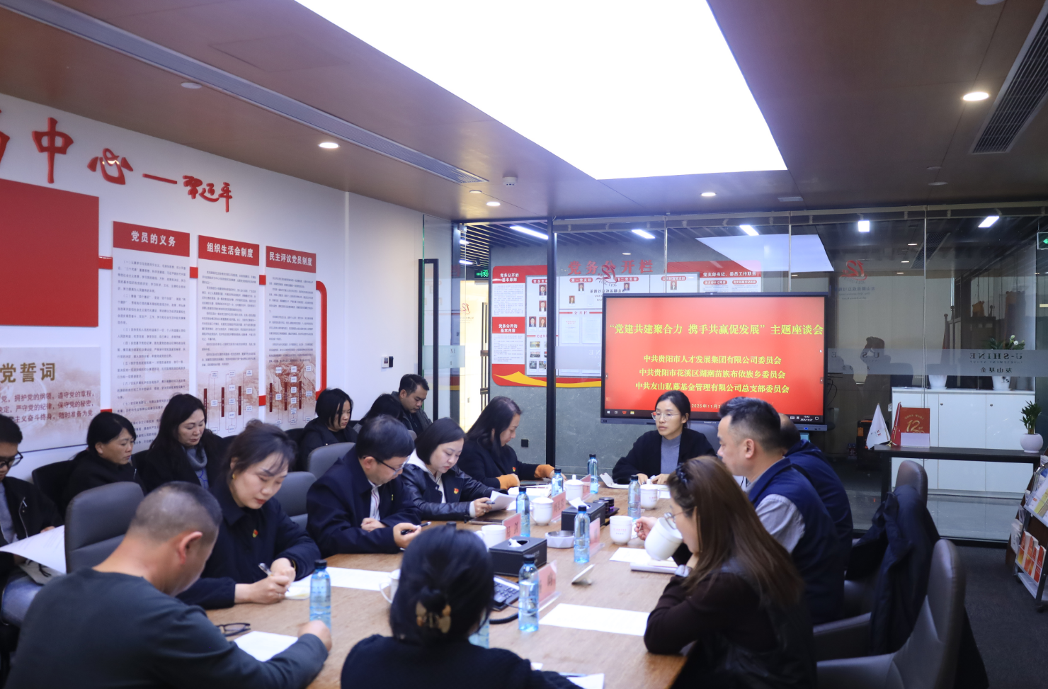 在随后的座谈环节,三方聚焦各自领域与党建工作融合、互促发展情况,分别从民营金融企业与党建、国有人才企业与党建、社区治理与党建三方面进行了深入的交流与探讨。刘耀表示,今天的座谈为今后各方的党建共建奠定了坚实的基础,友山基金公司将始终坚持以“党旗领航·金融润黔”为行动纲领,将红色基因深植公司治理与投资全流程,进一步加强与国企、社区各方的协助,共同探索一条以“活水”之势,滋养黔中大地的产业振兴与民生福祉的具体实践。易剑表示,此次交流生动展现了国有企业、民营企业和基层社区治理的实践成果。贵阳人才集团将以此次互动为契机,积极探索“人才+金融”和“人才+乡村”发展新路径,吸引更多的人才选择贵阳,扎根贵阳,为贵阳贵安高质量发展贡献专业力量。