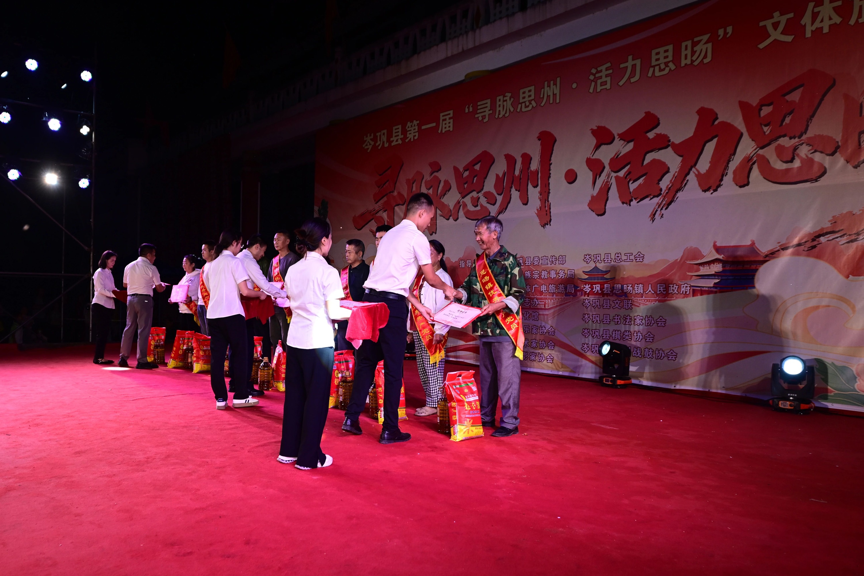 9月27日晚,贵州省黔东南州岑巩县思旸镇文化广场灯火璀璨,歌舞飞扬。以“寻脉思州·活力思旸”为主题的文艺晚会在此盛大启幕。 活动融合颁奖仪式、文艺演出与主题合影,吸引数千名群众热情参与,成为展示地方文化、弘扬文明新风的重要平台。