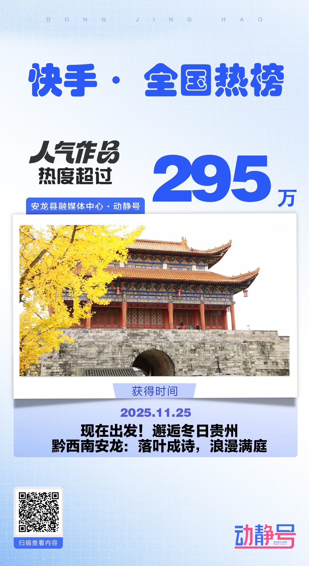 ▶️11月25日,依托安龙融媒视频素材进行二创并推出《现在出发!邂逅冬日贵州丨黔西南安龙:落叶成诗,浪漫满庭》,稿件实现多平台同步推广,成功入选“学习强国并总平台,并登上快手全国热榜,话题热度突破295万。