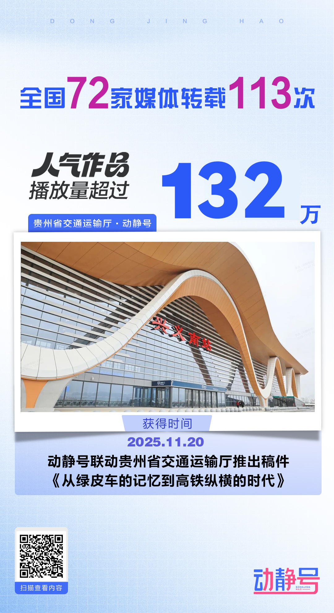 11月20日,动静号联合贵州省交通运输厅策划推出了原创视频《从绿皮车的记忆到高铁纵横的时代》,该作品以生动的影像语言,系统梳理并展现了贵州铁路从绿皮车时代到高铁网络化的历史性跨越与时代轨迹。发布后迅速引发广泛关注与强烈社会反响,累计获得全国72家媒体共计113次转载,仅在“动静新闻”客户端单一平台的播放量即突破132万。